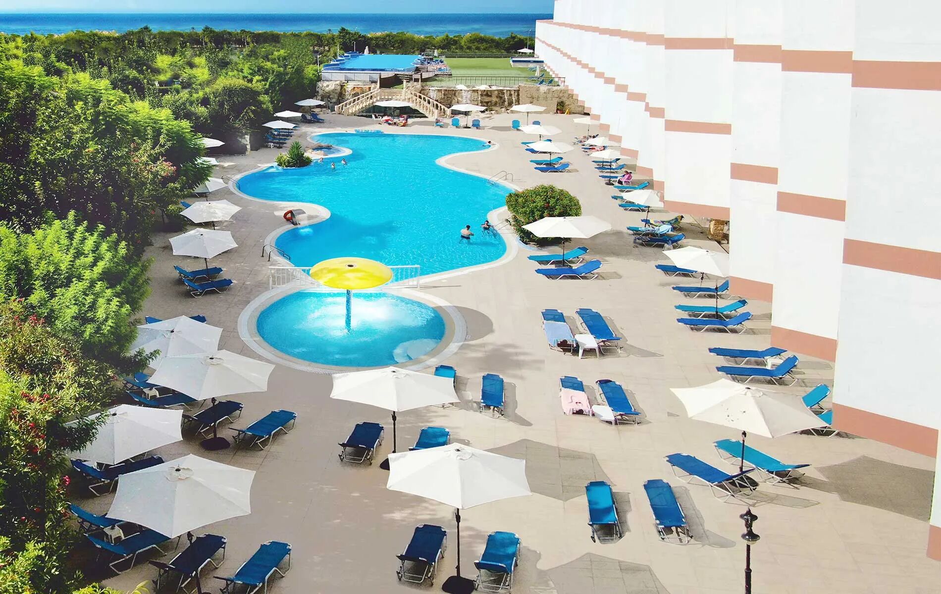 Nowoczesny hotel z basenem i basenem w formie fali, z tarasami do opalania, z widokiem na morze.
